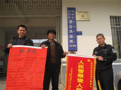 原来,这个年过花甲的老人名叫肖某,是早些时候一位走失的名叫梁某老妇人的丈夫,梁某是容县容州镇周口村人,患有老年人痴呆症,2013年12月26日在容县走失,当日她来到昙容街附近,但她不记得回去的路,在岑溪市昙容社区已经两天三夜露宿街头。12月29日8时多,梁某老人因饥寒交迫,晕倒在容岑一级公路边,不能再走动,有群众向110报警,我所户籍民警陈彦成接到110指令后,马上赶到昙容街口,扶起老人回到自己家中,然后做来热腾腾的饭菜,让老人吃下,然后询问得知这位老妇人名叫梁某,是容县周口村人。户籍民警陈彦成随即与容县110警方联系。约一个小时后,梁某的老伴肖某及其他家人赶到昙容街,与走失几日的亲人会面,梁某老人顿时热泪盈眶,其家人也非常感激,紧握民警的双手,连声说:谢谢……。时过几天,老人为了感激我所户籍民警的助人之举,便精心制作了一面锦旗、一张感谢信,特送到昙容派出所,以此表达全家人内心的感激。于是,便出现了开头的一幕。