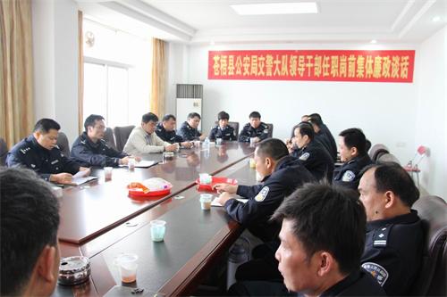 1月28日上午,苍梧县公安局交警大队举行新任职领导干部任职岗前集体廉政谈话。县公安局政委杨创新、副政委欧春锋、局党委委员、政工室主任宋金光、局纪委副书记、纪检监督室主任莫成洲参加了这次任职岗前集体廉政谈话。