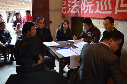 一间狭小的屋子内,摆放一张桌子,四条长凳,审判员、书记员、原、被告及其委托代理人各就各位,组成了临时的巡回法庭,并邀请镇人大代表参加,门口挤满了前来旁听的群众。