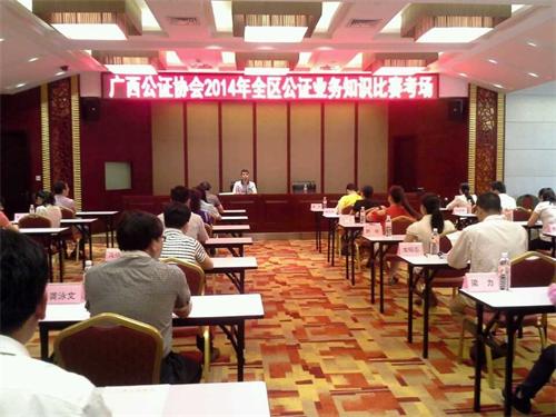 近期市司法局组织我市公证人员到南宁参加了广西公证协会举办的2014年全区公证业务知识比赛。5月13日上午,我市参赛的两名队员市公证处公证员刘子梅和岑溪市公证处公证员冯炳朝在南宁市桃源饭店三楼多功能会议室参加了笔试。