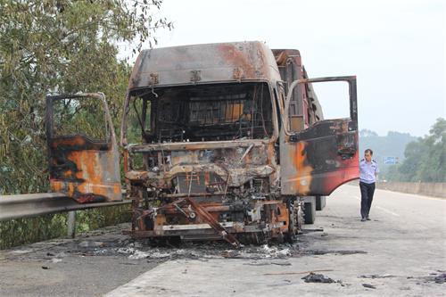 凌晨5时20分许,国道324线北村路段有一辆摩托车、助力车、电动车三辆车子相继发生碰撞,一辆运煤的半挂牵引车途径事故现场时,直接撞上倒在超车道上的助力车,助力车被卷入牵引车底部向前拖行。当牵引车驾驶员樊某下车查看时,意外发生了,牵引车车头底部突然冒出明火燃烧起来,大火向牵引车车头迅速蔓延。