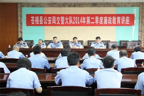 为了进一步加强队伍管理,整顿纪律作风,结合开展党的群众路线教育实践活动,查找队伍在“四风”方面存在的突出问题,5月23日下午,苍梧交警大队组织全体民警、协警、职工举办了2014年第二季度廉政教育讲座。