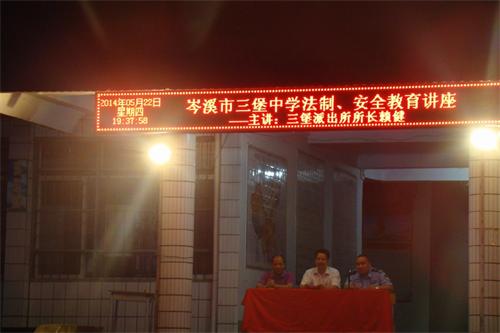 岑溪市公安局一直致力于关心辖区的青少年成长,考虑到近段时间已经进入了夏季,暑假又即将来临,青少年的思想以及行为都会受到社会上的一些不良风气所影响,给社会的治安环境造成不良的后果。鉴于此,岑溪市公安局三堡派出所所长赖健于2014年5月26日晚上,亲自到岑溪市三堡中学,与李校长一起组织三堡中学的全体师生,主讲了一堂生动而又励志的法制教育课。