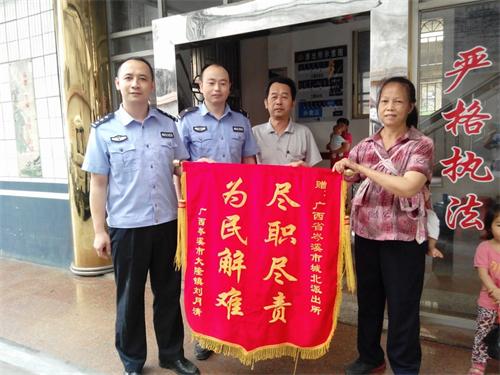 5月27日上午9时,一个中年妇女手拿锦旗,怀着感激之情走了岑溪市公安局城北派出所,当她见到值班领导和民警,连声说上次就是你们帮我找回了一万元,不然我都不知道怎么办,那可是我的血汗钱啊,你们民警真是为群众尽职尽责。