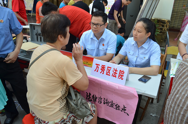 6月2日, 端午节当天,为了让群众过一个放心、祥和的节日,万秀法院组织法官到人群聚集的广场处进行法制宣传活动。此次宣传活动共发放宣传资料200余份,内容涵盖家庭婚姻、食品安全、消费者权益、城乡养老保险医疗保险政策等内容,受到了群众的广泛好评。万秀法院此次普法活动让广大群众在浓浓的端午气氛中吸收到基本的法律知识,用实际行动践行党的群众路线。