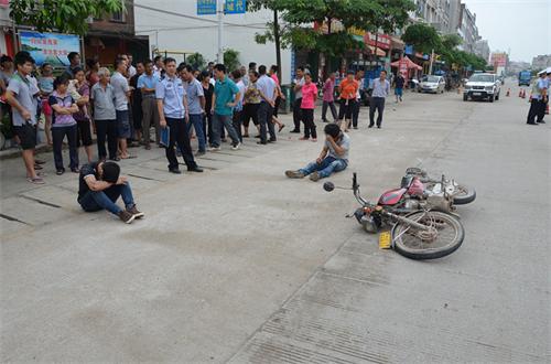 此时,这辆摩托车在前方企图调头逃避检查。但是,摩托车驾驶人在观察后方车辆时没有把握好方向,导致摩托车驶向路旁撞刮路边停驶的农用车,摩托车方二人摔倒在地。执勤民警发现后立即上前救助涉事摩托车上的二人。虽然涉事摩托车方二人并无大碍,可是摩托车驾驶人拒绝回答执勤民警关于姓名、住址、车辆信息等任何询问。