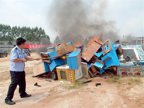 7月10日上午,苍梧县警方在龙圩镇集中统一销毁具有赌博功能的打鱼机、扑克机、水果机、老虎机等游戏机47台。