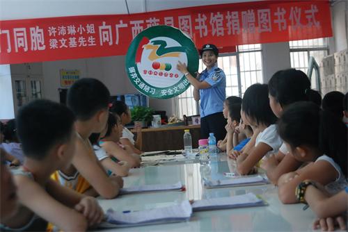 7月23日上午,藤县公安民警为该县署假美术书法班少年儿童上安全课。为确保留守儿童安全度过暑假,增强孩子们的安全意识,杜绝留守儿童这一弱势群体安全事故的发生,从7月上旬开始,藤县公安局及时组织开展“平安出行、快乐暑期”为主题的关爱留守儿童安全宣传教育活动,向他们及时传授交通安全、安全用火用电、防溺水、防盗抢等方面常识。