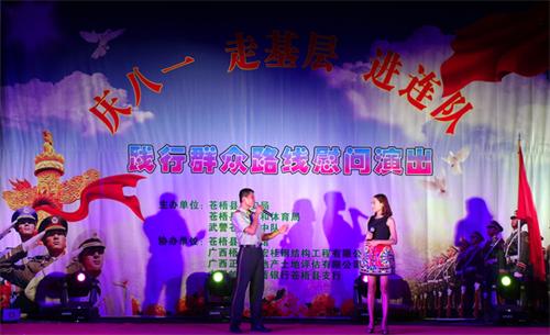 7月27日,在“八一”建军节87周年即将迎来之际,由苍梧县公安局、苍梧县文化和体育局、武警苍梧县中队主办的《庆“八.一” 走基层 下连队》践行群众路线联欢慰问晚会在武警苍梧县中队激情上演。