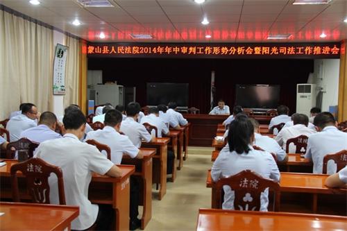 2014年7月31日,蒙山法院召开年中审判工作形势分析会暨阳光司法工作推进会,总结回顾了全院上半年的审判工作,分析了当前审判工作形势,研究部署了下半年工作,全院中层以上领导参加了会议。