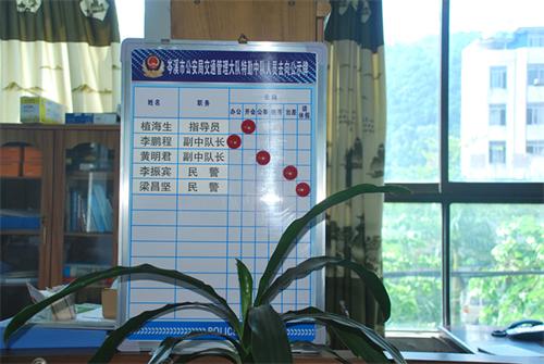 在践行群众路线教育实践工作中,岑溪交警想群众所想,着力解决办事群众想了解的问题,从细节入手,在单位及各中队实行了民警去向告知制度。