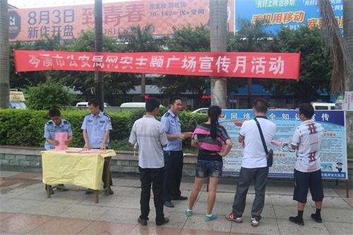 为切实有效防范利用互联网传播、散布暴力恐怖和宗教极端违法犯罪活动,全力维护社会大局稳定;提高群众安全防范意识,有效遏制网络犯罪和电信诈骗违法犯罪活动势头,最大限度预防和减少群众财产损失,根据公安厅和上级公安机关的统一部署,8月28日,岑溪市公安局组织网络警察大队民警来到市人民大广场开展网安主题广场宣传活动。
