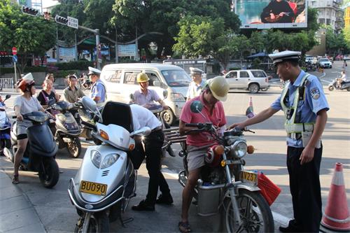 民警对存在已经办理注册登记但未悬挂号牌上道路行驶的电动自行车驾驶员以及不按交通信号灯通行的群众进行了劝导教育;同时,对于摩托车和“飞机仔”违法载人、无牌无证、不按规定车道行驶、不戴安全头盔等常见的交通违法行为,发现一起,处罚一起,绝不手软,形成严管重处的高压态势,使各类违法车辆无处藏身。