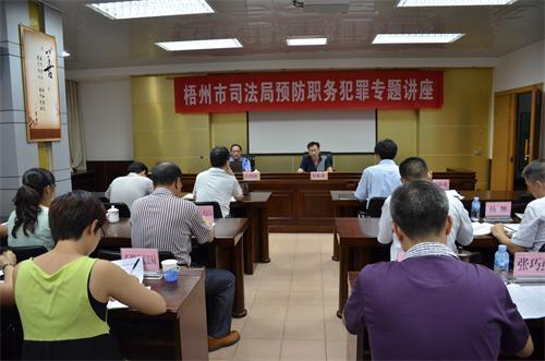 为大力弘扬法治精神,进一步开展“法律进机关”活动,全面提高全局干部职工的法律素质,提升服务大局、服务社会、服务群众的能力和水平,加强干部职工的廉洁警示和职务犯罪预防教育,从思想上筑牢拒腐防变的根基,9月15日晚上,梧州市司法局邀请梧州市人民检察院职务犯罪预防局局长肖明辉为本局全体干部进行预防职务犯罪专题知识讲座。