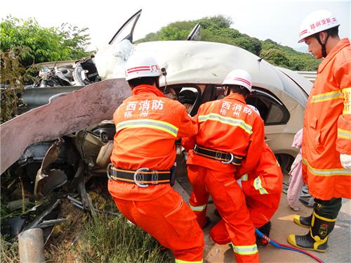 岑溪市公安局交通管理大队接到指令后,火速赶到现场,与120医务人员及时做好抢救工作。民警并在高速路上放置警示牌、锥茼封闭单向车道,做好防护工作。在事故现场,民警发现一辆大众桑塔纳小轿车撞上高速路中间的间隔护拦上,护拦把车头压夹着,车头严重变形,由于撞击力大,造成司机及坐在后排左方一人当场死亡,车上另外两名乘客已送往医院做进一步检查。