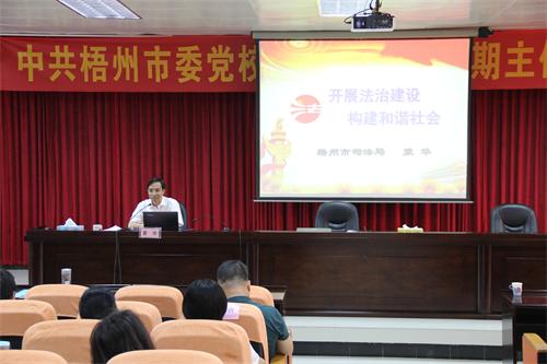 为全面贯彻实施“六五”普法规划,进一步加强梧州市领导干部学法用法工作实效,提高领导运用法治思维和法治方式的能力,10月8日上午,梧州市司法局党组书记、局长蒙华在市委党校教学楼礼堂,为参加秋季学期主体班的学员们作了一场题为《开展法治建设,构建和谐社会》的普法知识专题讲座。