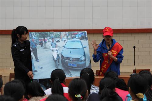 在小学的讲座中,通过一首交通安全童谣“红灯停,绿灯行,看看车辆再通行”、“千万系好安全带,更不伸手窗外闹,文明乖车要记牢”,解说了小学生在走路、乘车等方面应该注意的问题。