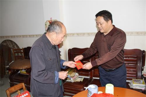 11月14日,藤县人民法院党组成员、政工科科长罗传忠代表法院党组到退休老党员覃杰智家中进行慰问。