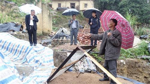 现场杂乱地堆放着建围墙的各种建筑材料,让测量工作无法进行,于是法官又与其他部门的同志们放下手中的雨伞,一起把木头和砖块抬开,便在雨中认真的对争议的排水沟及共用通道进行测量,与当事人进行交流明确双方的争议所在,寒雨淋湿了衣服都浑然不觉。