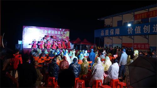 (农民工冒雨观看普法文艺演出)
