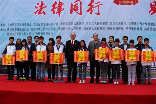 梧州市委常委、副市长朱艳华在致辞中说,2011年以来,梧州全市共举办校园法制讲座700多场,“法律进学校”文艺演出67场,开展模拟法庭进的校园32次,发放宣传资料100万份。通过圆桌法庭审理的未成年刑事犯罪案件占所有未成年犯罪案件的86.3%,开展“亲友帮教团”活动73次,未成年人再次犯罪率平均以26%的高比率逐年下降。本次活动,是精心组织策划的校园法治文化大餐,既是未成年人法治教育工作的创新,也是学生思想道德修养的延续。全市各中小学要高度重视未成年人法治教育工作,把普法和守法作为长期基础性工作抓紧抓好。宣传、文化、教育部门和人民团体要在学校普法教育中发挥职能作用,在全市上下形成学习法律,遵守法律,运用法律和敬畏法律的法治氛围,为梧州经济社会科学发展、跨越发展作出新的贡献。