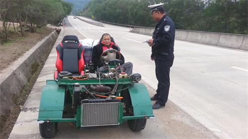 2014年12月9日,岑溪市公安局交通管理大队昙容中队民警在走访群众的过程中,行驶到国道324线岑溪市昙容路段时发现一辆无号牌的“敞篷老爷车”在道路上行驶,民警当即上前将其拦下检查,发现这竟然是一部纯手工制造的汽车,驾驶司机且无任何驾驶证。
