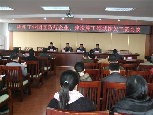 12月9日上午,在梧州工业园区召开了防范企业、建设施工领域拖欠工资会议。梧州工业园区管委会主要领导和下辖各部门主要负责同志,市住建委、市劳动监察大队领导,园区司法所负责人和有用工行为的企业代表参加了会议。