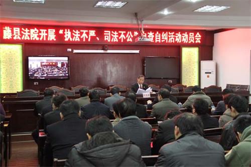 12月23日上午,藤县法院召开“执法不严,司法不公”自查自纠活动动员会,这是继今年开展的廉洁司法教育活动和“司法作风建设年”活动之后又进行的一次执法情况大检查活动,活动时间从2014年12月开始至2015年2月底止,历时3个月。