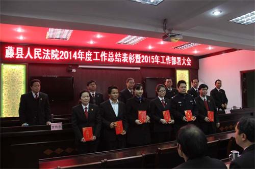 2月5日,藤县法院召开2014年度工作总结暨表彰大会,回顾总结过去一年工作情况,部署安排新一年主要工作,同时对表现突出的先进集体和个人进行表彰,鼓励全体干警奋发有为、再创佳绩。会议由院党组成员、副院长罗东强主持。