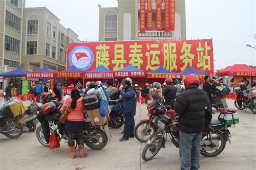 藤县春运服务站位于省道304线(南梧二级公路)藤县陶瓷工业园区路段,园区商铺一条街旁边,占地560多平方米。由藤县县委、县政府牵头组织,由藤县公安局交管大队具体负责实施落实各项筹备、运行工作;服务站启动以来,分别有县委组织部、县公安局交管大队、县团委、县三医、县食药监局、县工信局、县妇联、县总工会等单位,还有中国移动、联通、电信、广西农村信用社、桂林银行等企业,以及红豆社区、真龙香烟、太平飘雪米饼厂、文华大酒店等社会热心团体,进驻开展服务返乡摩托大军工作。每天常驻服务站工作服务的人员100多人次。