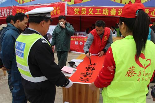 15日,藤县公安局牵头组织民警与志愿者队伍,在南梧二级公路旁边的藤县陶瓷园区的春运服务站,为途径藤县的返乡农民工书写春联,赢得了他们的支持和赞许。