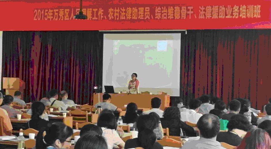 2015年4月28日,2015年万秀区人民调解工作、农村法律助理员、综治维稳骨干、法律援助业务培训班在梧州市长城大酒店举行。梧州市法律援助中心应邀为培训班授课。