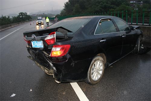 民警赶到现场发现,一辆桂J牌照的黑色丰田牌小型轿车横跨在高速路中央,车辆前后部位受损严重,司机在雨水中一脸茫然不知所措。由于事发现场正好是下坡拐弯处,很容易发生二次事故伤害,民警迅速在来车方向以警车挡道,同时打开车载LED显示屏提醒过往司机注意减速慢行通过。