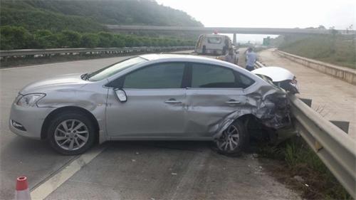 到达事故现场,值班民警发现一辆银色的日产小轿车车尾损坏,横在高速公路的行车道和应急车道间,车上人员无大碍。为了防止发生二次事故,值班民警钟岳光立即与协警将车上人员引导到高速公路护栏外相对安全的位置,然后在事故后方设置反光锥筒和提示标牌,并对过往车辆进行指挥,确保路面通行秩序良好。经了解得知,出事小轿车一行4人,从广东往南宁方向行驶,行驶到上述路段时司机感觉眼前有人横过高速公路,情急之下急踩刹车,导致车辆失控,车尾撞到高速公路右侧的防护栏,万幸车上4人无碍。最后施救队的拖车将事故车辆拖离高速公路,路面恢复正常通行秩序。