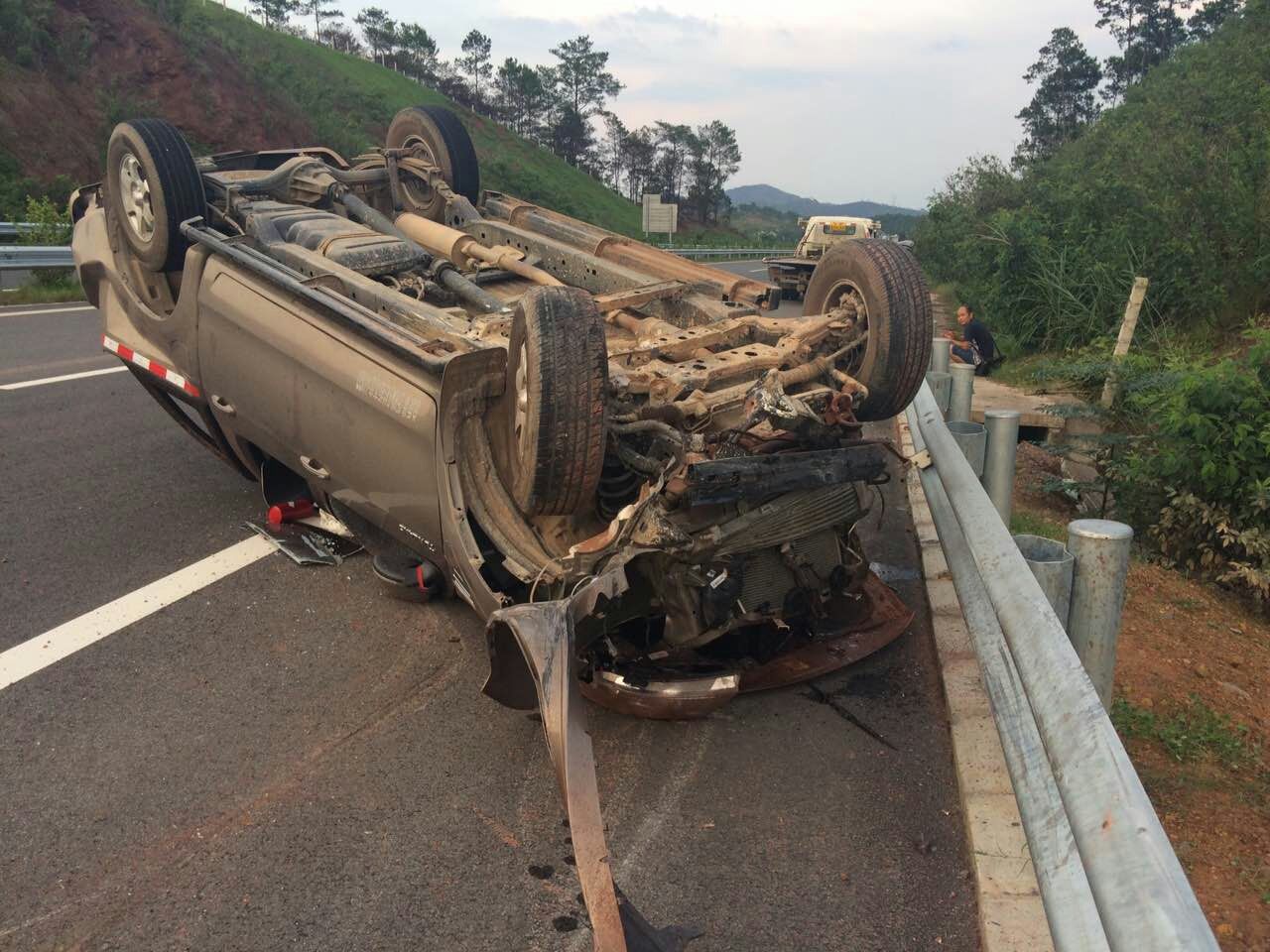大队值班民警接警后,迅速出警,并联系拯救车辆。当民警赶到现场是看到一辆皮卡车在高速公路应急车道上来个底朝天侧翻,车头受损,民警看到这一幕大吃了一惊,还以为只是撞护栏,并没有想到车辆来个底朝天运动,还好现场没有人伤亡。民警迅速在来车的方向摆放反光锥筒、事故提示牌,对应急车道进行封锁,并进行保护现场证据,提醒过往车辆前面有事故减速慢行,注意安全。同时迅速处理现场。在民警的有序的指挥之下,拯救车辆很快就到了,在民警和拯救车辆人员的努力下,20时4分交通道路恢复正常。