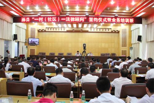 6月27日上午,藤县举办一村(社区)一法律顾问签阅启动仪式暨培训班。市司法局局长蒙华、市局政治部主任练泽明、藤县县委常委、政法委书记蒋健生、藤县司法局全体干部职工、各乡镇镇长、各司法所所长、拟签约的村(社区)法律顾问及各村(社区)主任参加了签约启动仪式。