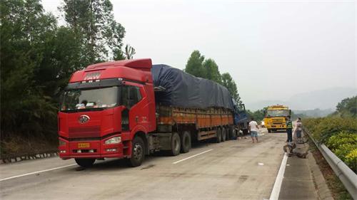 2015年7月15日凌晨4点56分,我大队接警称包茂高速岑溪往梧州方向有两货车追尾,有人受伤。接警后,我大队火速出警赶往现场。大队值班民警在出发途中与报警人联系确认事故发生地点,并通知路政、消防及120急救中心。
