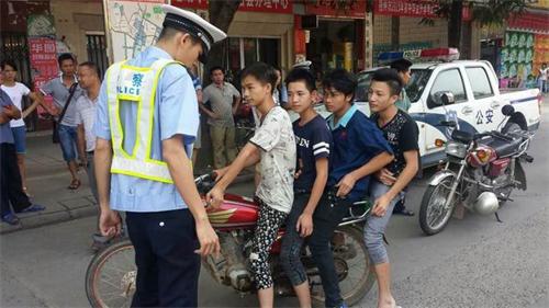 民警在检查中发现,除驾车者外,车后座上还坐着三名少年,当民警让其出示身份证和驾驶证时,该少车驾驶者神色慌乱,谎称忘在家里,并称自己会骑车已有2年多了,在民警的教育和询问下,该名少年才说出了实情:原来,他们是某乡镇初中的学生,驾车者今年只有15周岁,假日,趁家长不注意,私自将家中的摩托车开出来进城玩耍。当得知他们四人是从乡镇开到城里时,民警不禁捏了一把冷汗。了解完情况后,民警与其父亲取得联系,将四名少年及摩托车交由家长带回,并责令其加强教育及监督。