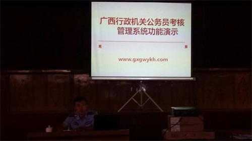 最后,由政治部人事科民警古富文详细对广西行政机关公务员考核管理系统功能进行演示,教导软件的正确使用方法,从登录系统、填写个人信息、填写个人年度工作计划、填写个人工作记实、填写个人工作总结、领导评鉴、民主测评、查询统计等每一个步骤都进行了详细操作与讲解。