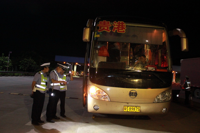 8月5日0时,一辆粤SB9XXX的贵港长途大型客车缓缓驶入粤桂交界处桂东收费站,检查中,民警发现该辆大客车下属广东东莞市XX汽车运输有限公司,该车核载44人,实载37人,没有包车线路牌和旅游线路牌证明等合法手续。随后,民警将该车移交给广西梧州市龙圩区交通运输管理所作进一步处理。