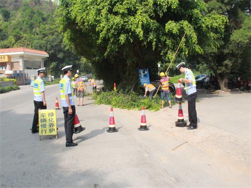 进入盛夏,道路两旁的绿化带变得郁郁葱葱,一些浓密的树枝遮挡了部分的交通标识牌、信号灯,给交通安全埋下隐患。为给群众打造安全、和谐道路,万秀大队积极配合市园林绿化部门对辖区多个路口、路段存在的遮挡交通设施、阻挡驾驶员和行人视线的树木进行修剪,切实消除道路安全隐患。