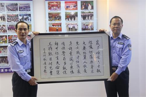(梧州市局政治部警务科科长董宇,听说老朋友关大荣光荣退休,也作诗一首:“昔日沧海搏激流,声名传播满岑州。无情岁月匆匆过,弹指之间六十秋。为警清廉家风正,夜闻敲门心不忧。含饴弄孙执子手,自由人身胜‘薄周’”。)