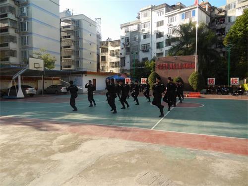 在演练中,岑溪市公安局防暴队员进行了擒敌拳、抓捕“武疯子”、队列队形基本训练等科目的演练。在近半个小时的演练中,防暴队员们精神抖擞、斗志昂扬地演练了他们近一年多来所学到的各种警务技能,充分展现了他们精湛的技能和良好的精神风貌。观看演练后,梁达斌、梁兵对反防暴中队成立以来各项工作所取得的成绩给予了充分肯定,要求继续加强队伍思想和纪律作风建设,加强对队员们的敬业精神教育,使他们始终做到警容严整、听从指挥,打造良好的形象;要积极配合开展街面巡逻防控工作,严厉打击各种街面多发的违法犯罪活动,不断提升人民群众的安全感和满意度;要加强业务训练,特别是要加强队员的体能训练和警务技能训练,努力把防暴中队打造成为一支关键时刻能迅速拉得出,并“来之能战、战之能胜”的尖刀队伍和重要力量。