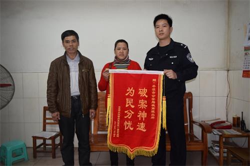 1月14日,樊某某的4700元人民币现金在岑溪公安民警的帮助下失而复得,樊某某及其丈夫难掩心中的喜悦,向岑溪公安民警赠送了一面锦旗,表达对公安机关的无限感激之情。