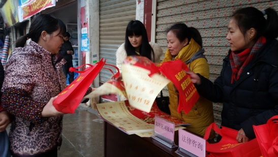 天空虽然下着中雨,但丝毫没有阻挡我们开展法治宣传的步伐和群众的热情,活动场面温暖人心。针对年底返乡务工人员较多的情况,我们专门加大了涉及农民工讨薪、工伤赔偿、法律援助知识的宣传力度,帮助外出务工人员培养维护自身合法权益的意识。在设置的宣传台前,我们还就群众关心的法律法规问题和实际难题进行了耐心解答。整个宣传活动持续了一个多小时,直接服务群众100多人次,共发放宣传环保袋、宣传年历、宣传杯子及《中华人民共和国宪法》选读、《法律援助服务指南》、《社区矫正—没有“围墙”的改造》等4000余份。我们制作的法治宣传单、宣传画和法律书籍通俗易懂、贴近生活、实用性强,受到了群众的普遍欢迎。