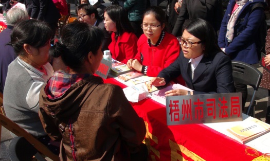 3月1日上午,为扩大《反家庭暴力法》的宣传覆盖面,继举办梧州市妇女学习《中华人民共和国反家庭暴力法》培训班后,市司法局与市妇联、市委宣传部、市中级人民法院、市检察院、市公安局、市教育局等多个部门,共同在梧州法治公园潘塘广场开展梧州市2016年“三八”妇女维权活动,以开展法治文艺表演、组织法律知识有奖问答、布置普法展板长廊、发放法治宣传资料、提供法律咨询解答等形式,以《反家庭暴力法》为重要内容进行普法宣传教育。并在公园中设置了“社区法律课堂”,针对《反家庭暴力法》向群众进行解读,让法治课堂走出户外,让更多的群众能够学到法律知识,也让更多的妇女知晓《反家庭暴力法》,树立“自尊、自信、自立、自强”的精神,提高依法维权的能力,学会用法律维护自身合法权益。
