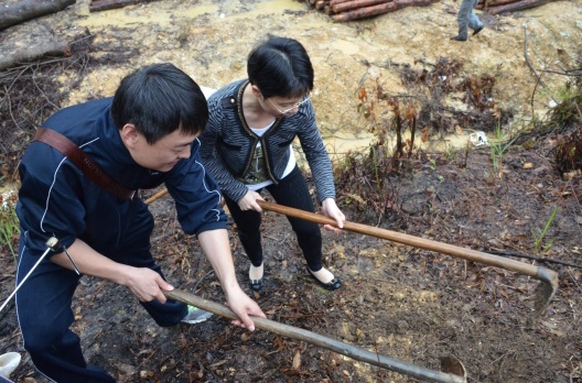 座谈结束后,市司法局的党员干部与金田村干部一起冒雨来到帮扶贫困户林地山上种植“鸦胆子”中草药树苗。