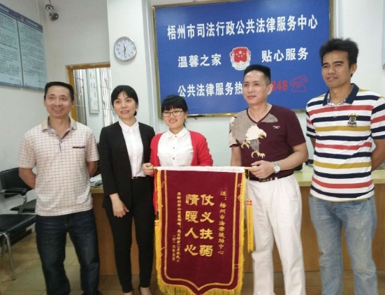 受援人向梧州市法律援助中心赠送锦旗(左二为案件承办律师周敏)