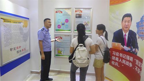 基地内还设有毒品样品展示柜,易大队长详细地向盟员介绍和讲解毒品的种类和危害,易大队长说:“目前的吸毒人员呈低龄化趋势,青少年是以吸食新型合成毒品为主,例如冰毒和神仙水。我曾抓到的吸毒人员最小的只有十四岁,心里有种说不出的滋味。”