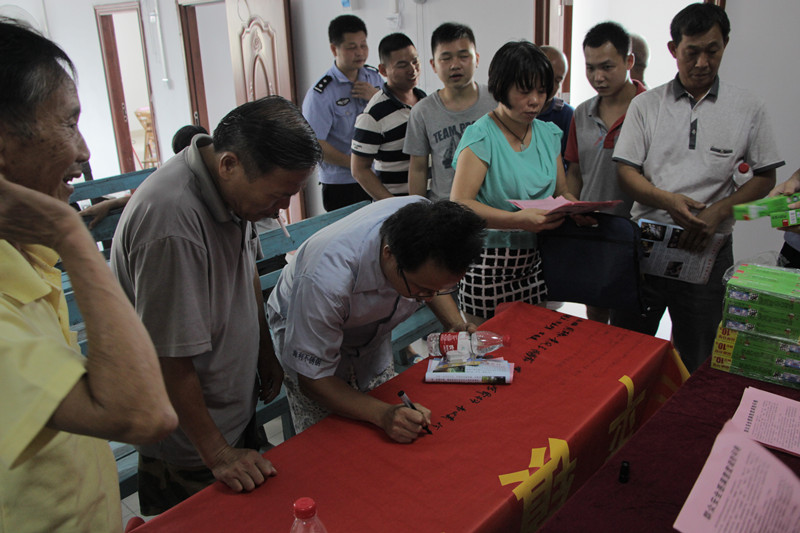 最后,为营造全社会支持、参与禁毒工作的浓厚氛围,郭副政委倡导、动员群众参与“珍爱生命·远离毒品”禁毒万人签名活动,得到了大家热烈的响应,村民们纷纷在签名横幅上写下自己的名字。